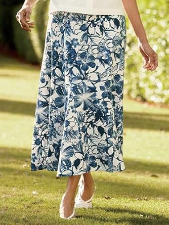 Curved panels and godet insets at the hem create an easy fit and a slender look for the wearer of this long linen skirt. Side-zipper entry with hidden elastic in the back waistband. Unlined. Long linen skirt in blue floral. Pure linen. Washable. Imported. Sizes: 6-20; about 33" long.